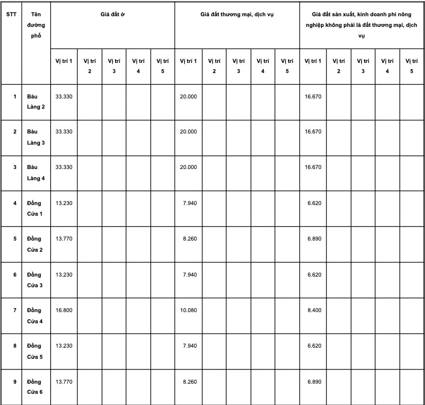 Bảng giá đất ở phi nông nghiệp đối với 16 tuyến đường mới tại TP Đà Nẵng