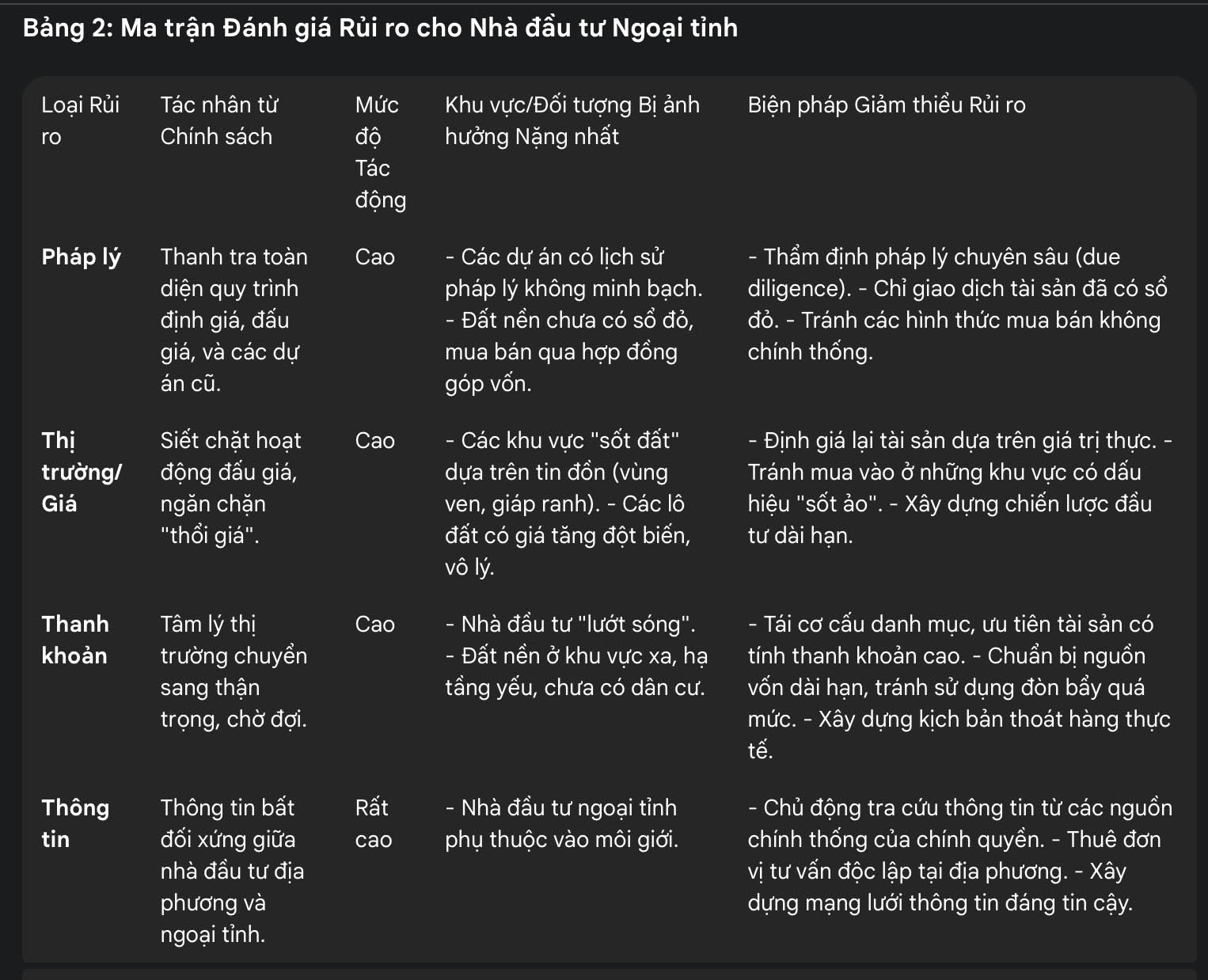 Đối với nhà đầu tư ngoại tỉnh, rủi ro này càng lớn hơn do sự thiếu hụt thông tin và mạng lưới tại địa phương. Họ thường phải dựa vào thông tin từ môi giới, những người có thể đang tìm cách "đẩy hàng" nhanh các sản phẩm có pháp lý yếu kém trước khi đợt thanh tra lan rộng. Trong giai đoạn chuyển giao chính sách này, rủi ro lớn nhất đối với họ là "rủi ro thông tin bất đối xứng". Những người am hiểu thị trường địa phương có thể hành động trước để thoát khỏi các tài sản rủi ro, trong khi nhà đầu tư ngoại tỉnh có thể trở thành người cuối cùng mua phải những tài sản này. Do đó, việc phụ thuộc vào các kênh thông tin không chính thức trở nên cực kỳ nguy hiểm.