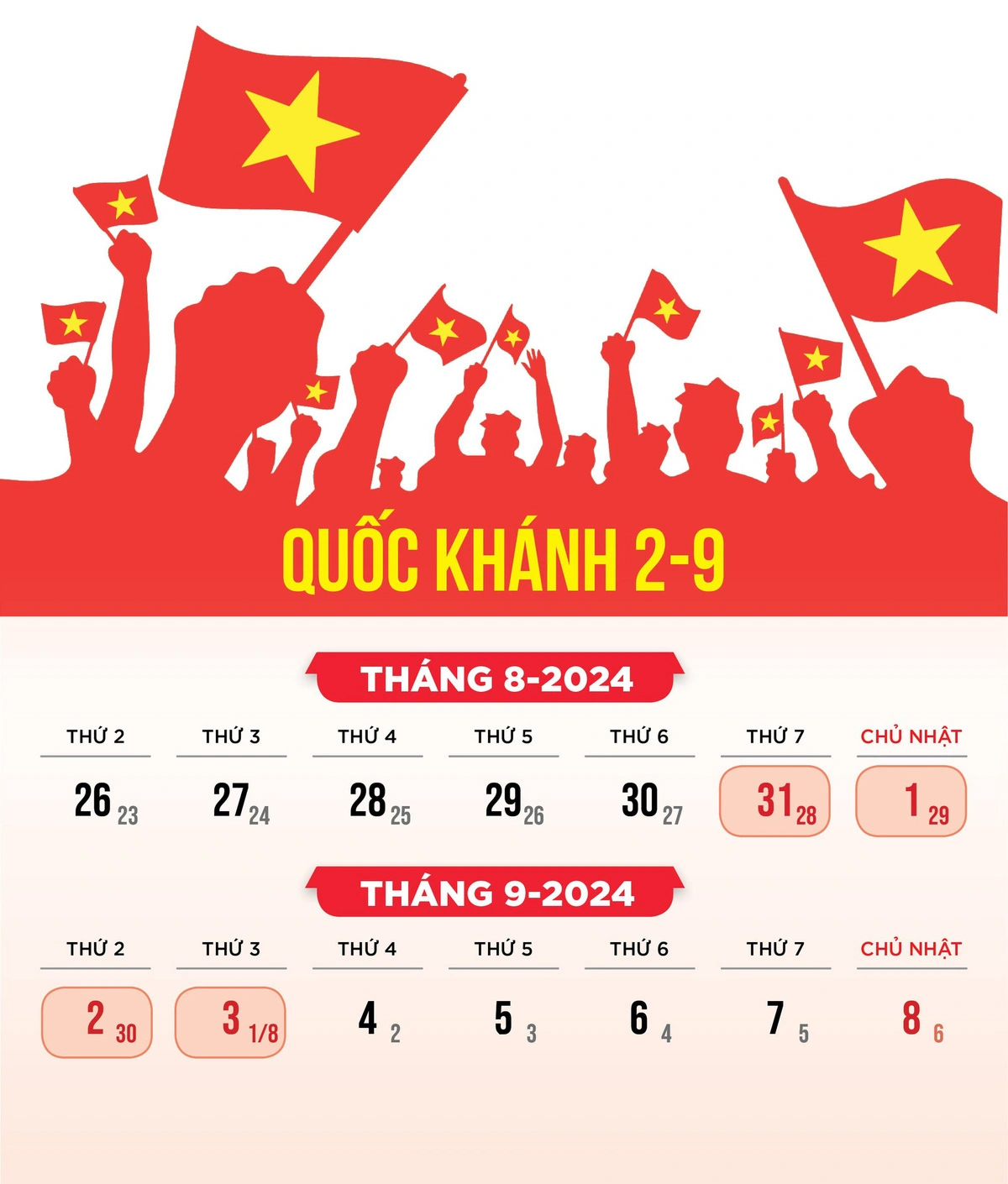 • Thời gian nghỉ lễ: Từ ngày Thứ Bảy, 31/8/2024 đến hết Thứ Ba, 03/9/2024.