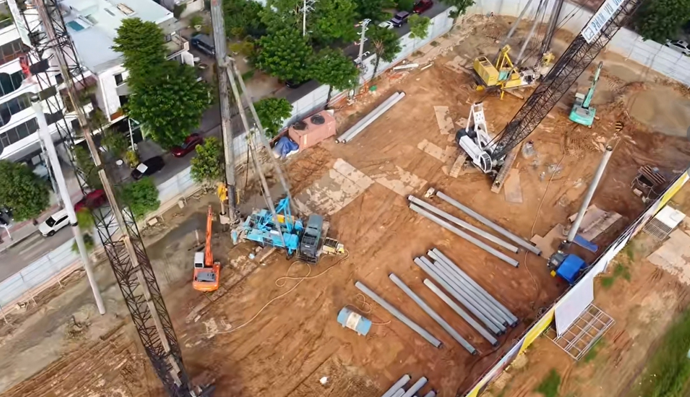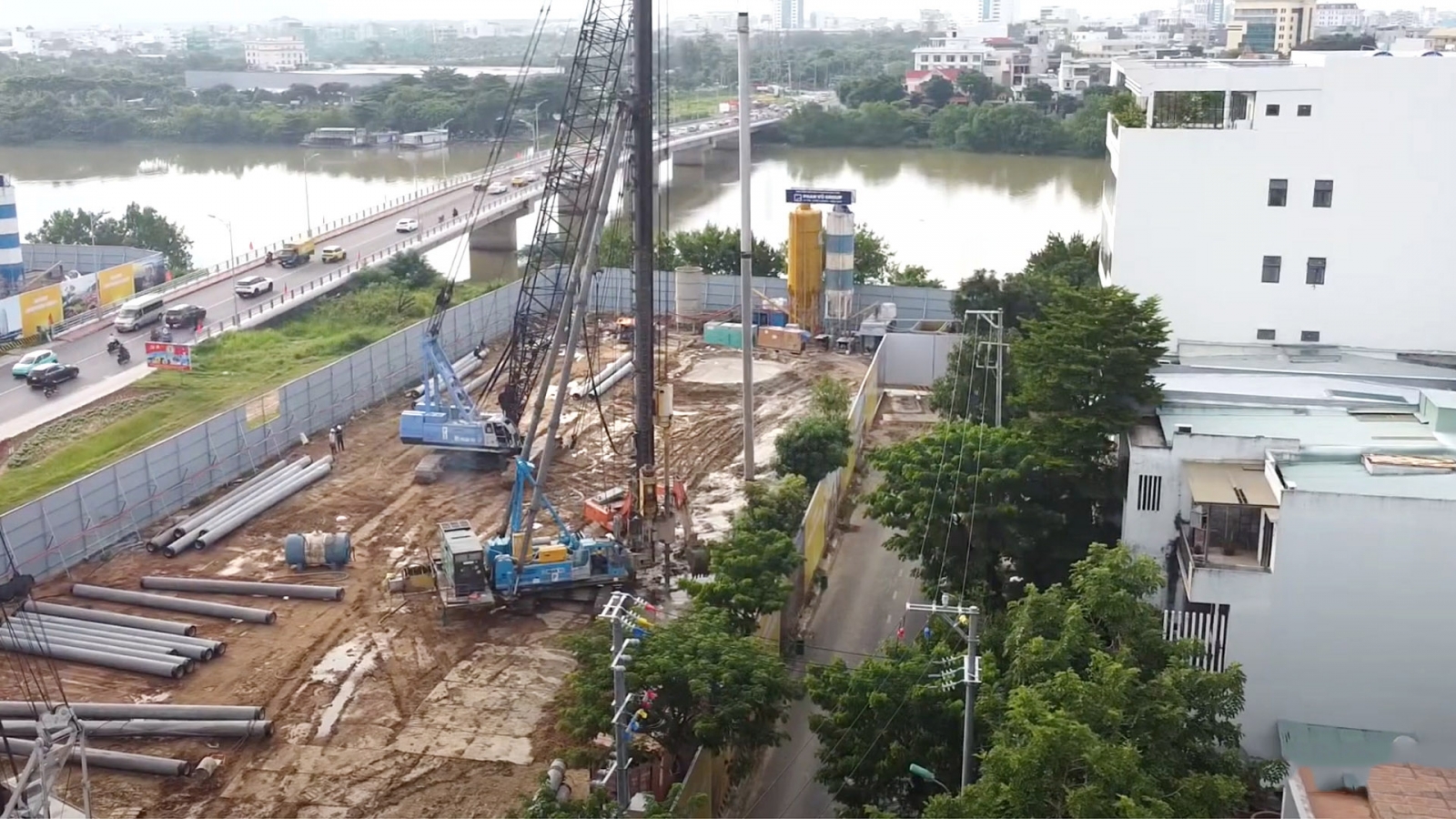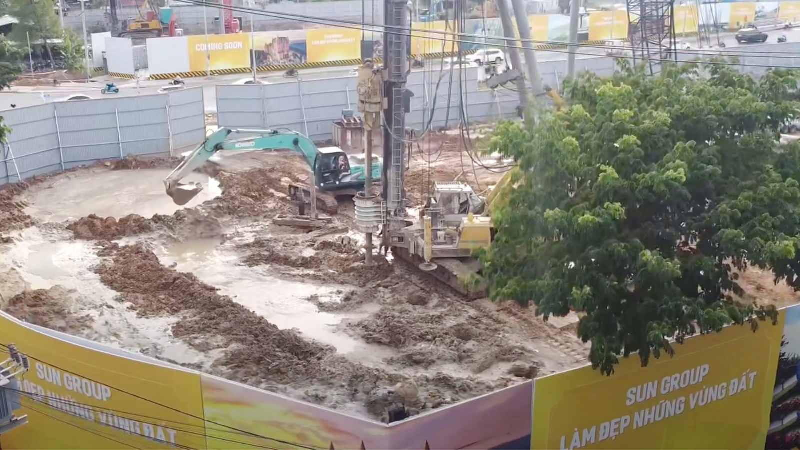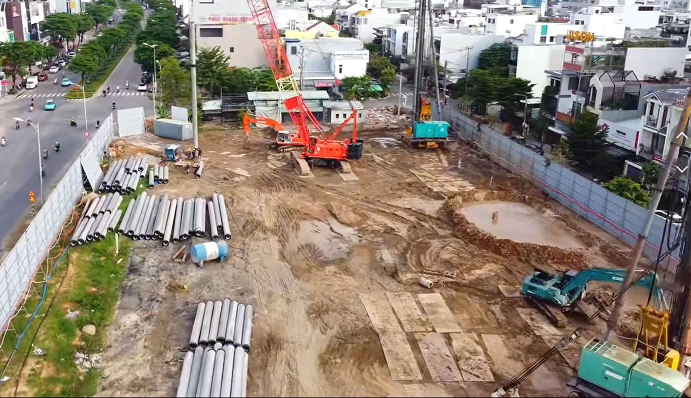 Công tác móng cọc, hạ tầng kỹ thuật đang được triển khai đồng loạt với hệ thống máy khoan, cần cẩu hiện đại.