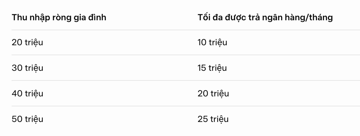 Hành động ngay: Lấy giá nhà bạn định mua × 50% = số tiền tối đa được vay. Viết con số đó ra giấy, dán lên tủ lạnh. Đó là “lằn ranh sinh tử”.